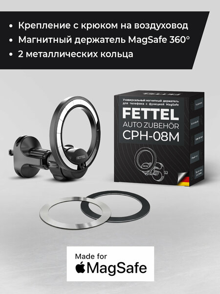 Магнитный держатель - это полезный аксессуар, который подарит удобство использования мобильного телефона в машине. Автодержатель для смартфона крепится к любому типу решеток, в том числе на решетку вентиляции, на воздуховод с помощью усиленного металлического крюка. Надежное крепление оснащено вращающейся головкой (поворотная, на 360 градусов), мощным магнитом. Автомобильный кронштейн с функцией MagSafe работает с iPhone от 12 модели напрямую, а с остальными Айфон и Android - с помощью подключения через соединительное металлическое кольцо. Удобная подставка позволяет использовать телефон в качестве надежно закрепленного штатива, которому не страшны неровности дороги и тряска во время движения. Это комфортно, если вы используйте установленную на смартфон навигационную систему во время поездки или просто следите за информацией на экране - дисплее. Подставка - держалка с фиксатором кабеля зарядки выполнена в черном цвете и лаконичном дизайне, чтобы гармонично смотреться на автомобильной панели в салоне машины. Для надежного крепления универсального автотовара соедините шарнир держателя и гайку кронштейна отрегулируйте положение и затяните гайку. Раскрутите гайку регулировки крюка таким образом, чтобы достичь его максимальной длины. Вставьте металлический крюк держателя в отверстие решетки воздухоотвода и закрутите гайку регулировки до полной фиксации держателя. Для крепежа на кольцо заранее очистите и обезжирьте поверхность для этой принадлежности, выберите место наклейки кольца (оно должно быть максимально приближено к центральной части поверхности). Снимите защитный слой полиэтиленовой пленки и приклейте кольцо (подождите 30-60 минут для максимально надежного сцепления клея). Компактный холдер - держатель - это удобный автоаксессуар для любой машины, в том числе легковой или грузовой. Полезный гаджет - девайс - это хороший подарочный вариант, который по достоинству оценят мужчины и женщины - автомобилисты, а также парни и девушки - автолюбители. Это хороший подарок для жены или мужа - любителей дальних путешествий, для отца или брата - дальнобойщика. В комплекте магнитный держатель (крутящийся на 360 градусов) - 1 штука, два металлических кольца (пластины для магнитного держателя) и регулируемое крепление с крюком - 1 штука.