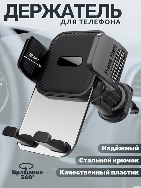 Автомобильный держатель для телефона с уникальным стильным дизайном станет настоящим украшением в вашей машине. При этом не смотря на свой изящный вид обеспечит вашему телефону самую надежную защиту. Корпус изготовлен из прочного и качественного материала, все выдвижные части усиленные. Автодержатель в воздуховод легко установается в вентиляционную решетку автомобиля при помощи регулируемого металлического крючка, который раздвигается до 3 сантиметров. Автоматический телефонный держатель надежно удержит самый тяжелый смартфон даже в чехле и справится с любым бездорожьем. Универсальный крепеж подойдет для различных популярных моделей и марок от 4 до 7 дюймов, габариты которого: ширина до 98 мм, глубина до 15 мм, высота не имеет значения. Плавная работа раздвижного механизма обеспечивает быструю и простую установку смартфона, без отвлечения внимания от дороги. Регулируемая подставка с поворотом на 360 градусов способна выдержать мобильное устройство до 2 кг. Возможно зафиксировать держатель как в горизонтальном, так и вертикальном положении. Часть боковых усиленных зажимов, соприкасающаяся с мобильным телефоном, проложены резиновыми накладками, которые эффективно защищают его от царапин при самых сильных вибрациях во время движения авто. Держалка для телефона в дефлектор подходит машине имеющей прямые решетки системы охлаждения. держатель для телефона автомобильный, держатель для телефона в машину на панель, держатель для телефона в машину на решетку, держатель для телефона в машину на дефлектор, держатель для телефона в авто