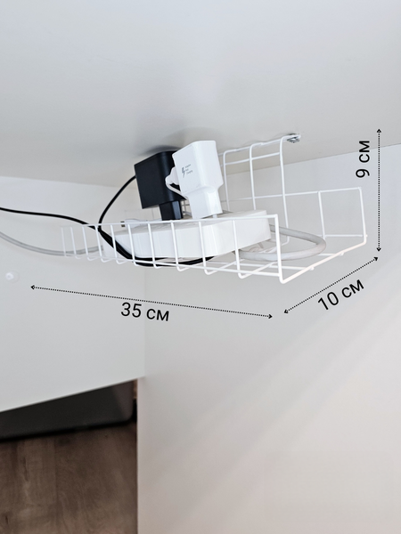 Сетчатый держатель для кабелей, удлинителей и сетевых фильтров предназначена для их крепления и фиксации под столешницей письменного, рабочего, компьютерного, школьного стола, под партой. Органайзер крепится на саморезы и подвешивается под столом. Приспособление поможет организовать порядок на рабочем месте дома или в офисе и забыть о мешающихся и путающихся проводах под ногами. Рекомендуем перед покупкой обратить внимание на размеры корзинки, так как изделие довольно объемное. Если длина все-таки оказалась больше необходимой, то ее можно укоротить с помощью кусачек для проволоки.