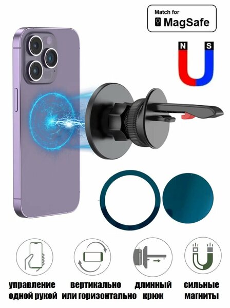Автомобильный держатель MagSafe на вентиляционную решетку c выдвижным крюком для iPhone 16, 15, 15 Plus, 15 Pro, 15 Pro Max, 14 Plus / 14Pro / 14 Pro Max/ 13/ 13 Pro / 13 Pro Max / 13 mini/ 12 / 12 Pro / 12 Pro Max / 12 mini. В отличие от обычных магнитных держателей не требуется использование металлической пластины. Семь встроенных магнитов фиксируют зарядное устройство на задней панели iPhone 12 - 15 серий. Функция работает только со снятым чехлом! Возможность поворота на 360 градусов. Также совместим со смартфонами, которые используют чехлы с функцией MagSafe или с наклеенным металлическим кольцом MagSafe (входит в комплект). Держатель имеет семь мощных встроенных неодимовых магнитов, которые обеспечивают супер сильную фиксацию и позволяют использовать держатель с обычными смартфонами при условии наклеивания на них дополнительных металлических пластин. Круглая металлическая самоклеющаяся пластина также входит в комплект.