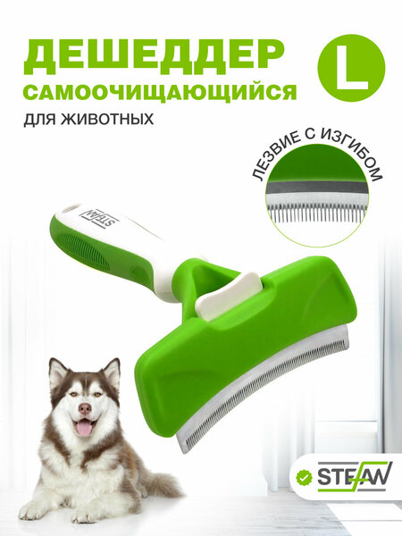 Самоочищающийся дешеддер для длинношерстных и короткошерстных кошек и собак с изогнутым лезвием удаляет большее количество волосков, при этом не травмируя и не причиняя дискомфорта животному во время процедуры. Дешеддер для кошек и собак - инструмент, предназначенный для вычесывания животных. Щетка пуходерка для кошек и собак представляет собой специализированное устройство, предназначенное для эффективного вычесывания подшерстка животных и сокращения периода их линьки. Весь секрет щетки заключается в их уникальных конструктивных особенностях. На удобной, прорезиненной ручке закреплен гребень-лезвие с многочисленными прорезями, которые очень быстро и безболезненно удаляют омертвевший подшерсток животного, не повреждая остевой волос. Стальные лезвия дешеддера проникают глубоко внутрь шерсти и удаляют выпавшие волоски, частички грязи с поверхности и из подшерстка животного. Уникальная закругленная форма дешеддера лучше скользит по телу животного, увеличивая область соприкосновения между лезвием и шерстью, что обеспечивает более быстрый и эффективный процесс вычесывания. Для удаления скопившейся на лезвии шерсти, достаточно нажать одну кнопку. Противоскользящая ручка с эргономичным дизайном сделает процедуру ухода за питомцем комфортной и удобной для Вас. Размер L используется для вычесывания животных крупных и средних пород. Размер р/п 100мм, длина зубьев 6мм, 90 зубьев