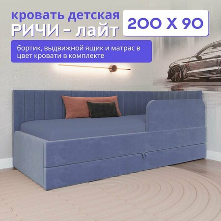 Детская диван-кровать 200*90 с выкатным ящиком, бортиком и матрасом в цвет кровати. Ричи Лайт пыльно синий