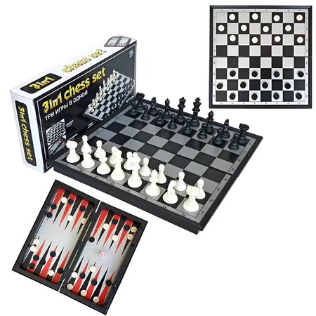 Увлекательная настольная игра, набор 3 в 1: дорожные шашки, шахматы и нарды с магнитным полем. Размер упаковки: 24,5 х 4,5 х 12,5 см. Комплектация: - двустороннее игровое поле (размер в разложенном виде: 24 х 24 х 4 см), - 32 шахматные фигуры (диаметр основания 1,3 - 2 см), - 30 фишек для игры в шашки (диаметр 1 см), - 2 игральных кубика размером 1 х 1 х 1 см. Традиционные стратегические игры интересны и для детей и для взрослых. Они развивают память, логическое мышление и повышают интеллектуальные способности. Одна сторона доски предназначена для игры в шахматы и шашки, вторая сторона разлинована для игры в нарды. Корпус игрового складного поля изготовлен из пластика. Магнитные шахматы chess - это отличный и удобный вариант дорожных игр, фигуры крепко держатся на магнитном поле. Устраивайте турниры и соревнования всей семьей, веселитесь с друзьями, дарите игру на праздники, ведь это отличный подарок на новый год, День рождения, 23 февраля и 8 марта для девочек и мальчиков! Подойдет для домашнего отдыха, путешествий или любительских турниров на улице, в саду и в дороге. Скорее переходите в наш магазин - мы знаем, как сделать Вашего ребенка самым счастливым! "Чудо-Юдо" - это широкий ассортимент детских товаров, все самое лучшее по приятной цене. Новинки и популярные товары уже ждут Вас в нашем магазине! С Вас вопрос - с нас грамотная консультация по товару Мы проверяем товары перед отправкой и надежно упаковываем. Желаем приятных покупок! Напиши свой отзыв - помоги нам стать лучше!