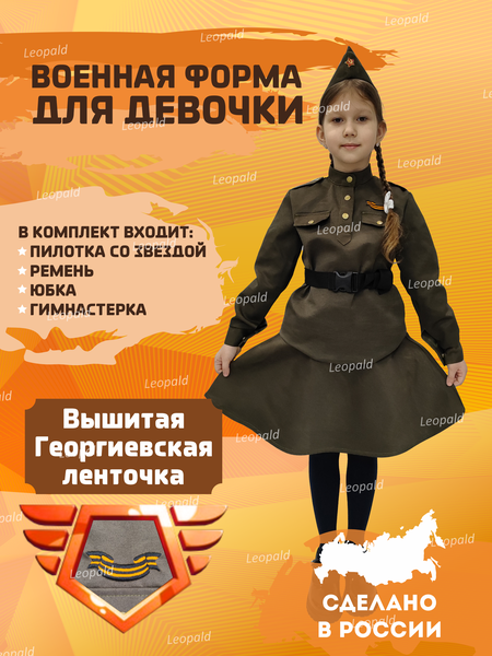 Костюм рядового состоит из гимнастёрки, пилотки с металлической звездой, ремня и брючек или юбки. В подарок идёт также георгиевская лента (для девочек с украшением в виде цветочка). Материал детской военной формы - грета. Одежда из этой ткани дышащая, не шуршит, не линяет. Удобная застёжка на кнопки. Рукава гимнастёрки с застёгивающейся манжетой, имитирующими кармашками и погонами. Брючки и юбка на резинке. Ремень выполнен из эластичной ленты с удобной застёжкой. Пилотка со звездой дополняет образ юного бойца. Армейская одежда для вашего ребёнка на тематический праздник поможет вам в воспитании его патриотического чувства. Одежду военных лет можно одеть на утренник ко Дню Победы, 23 февраля, на тематический праздник или фотосессию, спектакль, для поздравления ветеранов. Подойдёт под любую обувь. Широкий размерный ряд.