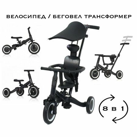 Детский беговел-велосипед 8в1 с крышей и ручкой, черный - TR008C-BLACK