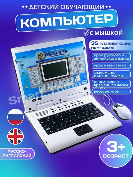 Детский обучающий и развивающий ноутбук это умная книга и настоящая находка для родителей и детей дошкольного возраста от 3 лет. Первый электронный учебник сочетает в себе игровой ПК. Он предоставит вашему ребенку интересные задания, упражнения и развлечения, которые превратят процесс учёбы в увлекательное приключение каждый день. Интерактивная игрушка включает 35 функций, это уроки русского и английского языка, куда входит изучение букв, слов и алфавита, а также грамматики со знаками препинания и синонимов с антонимами, математики, включающей цифры и счет, знакомство с днями недели и определение времени по часам, а еще веселые игры и рисование. Музыкальные и интеллектуальные программы обучения помогут дошкольнику в развитие таких навыков как логика, мышление и мелкая моторика, а также внимание и память. Это незаменимый помощник на пути к новым знаниям и в подготовке детишек к школе. Маленький размер и легкий вес сделают этот компактный мини ноутбук с пластиковым корпусом лучшим спутником малыша в путешествие, в поездке или на прогулке. Игрушечный компьютер оснащен удобной клавиатурой и мышкой, поэтому его использование станет еще более комфортным, а безопасный черно-белый экран для глаз позволит деткам не ограничивать время занятий. Подарите вашему начинающему первооткрывателю мир удивительных открытий и бесконечных возможностей с помощью уникальной машины в виде персонального детского компьютера. Модель доступна в разных цветах: синий, розовый и в других оттенках. Этот современная компьютерная подарочная развивалка сопровождается песнями, мелодиями и разнообразными звуковыми эффектами. Купите своим ребятишкам этот полезный и красивый подарок. Он подойдет как для девочек так и для мальчиков в День рождения, на 23 февраля или на 8 марта, а также на любой другой праздник или даже просто так без повода. Прикольный гаджет имеет в наборе проводную мышку, инструкцию и учебные развивашки. Работает от батареек 3 штуки (в комплект не входят AA)