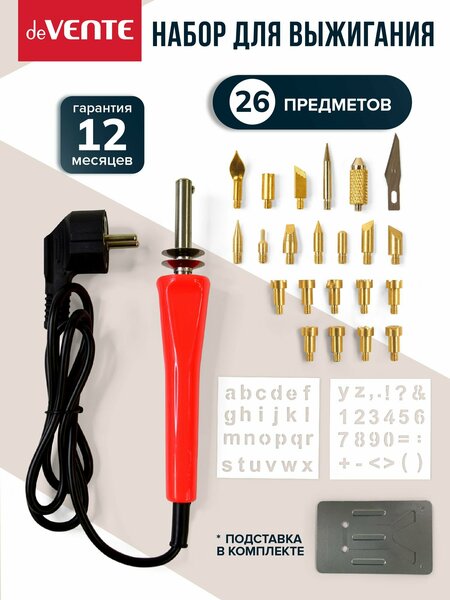 Набор для выжигания deVENTE. Pyrograph электрический, 26 предметов, мощность 30 Вт, шнур 1,1 м. Набор для выжигания – это профессиональный инструмент, который позволяет создавать уникальные и красивые узоры на различных поверхностях. Этот набор включает в себя 26 предметов и является идеальным выбором для тех, кто увлекается рукоделием или хочет добавить элементы декора в свои проекты. В комплекте с набором идет удобная подставка, которая обеспечивает безопасное хранение и использование инструмента. комплектация • профессиональный выжигать • 22 насадки • 2 трафарета • подставка • пластиковый бокс для хранения Главным компонентом набора для выжигания является профессиональный выжигатель. Он обладает следующими характеристиками: • Напряжение: 220-240 В • Мощность: 30 Вт • Частота переменного тока: 50 Гц • Температурный диапазон нагрева: 370 - 500 С • Время разогрева до рабочей температуры: 3-4 мин. • Длина шнура: 1,1 метра • 4 вентиляционных отверстия. Профессиональный выжигатель оснащен удобной ручкой, которая обеспечивает комфортное и точное управление инструментом. Тепловой экран предохраняет руку от ожогов, а заменяемое жало позволяет использовать различные насадки для создания разнообразных узоров. Гарантия 12 месяцев.