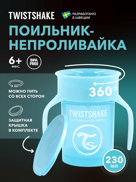 Шведский бренд Twistshake представляет инновационную и стильную новинку – кружку-поильник 360° Cup! Кружка-поильник – настоящая находка для родителей и малыша 6+ мес, который учится самостоятельному питью: края 360°, защита от проливания и ручки, удобные для захвата. Объём – 230 мл. – Легко пить с любой стороны. Малыш совсем как взрослый! – Конструкция с защитой от проливания: смело держите поильник вверх дном! И можно контролировать скорость питья. – Очень нежно. Силиконовый ободок делает чашку-непроливайку мягкой для губ ребёнка. – Безопасные материалы без вредных веществ и химикатов в составе. – Основа из прочного пищевого пластика. Встряхивайте, бросайте, роняйте – ничего не случится! – 2 боковые ручки для удобного захвата. Специально для детей! – В комплекте – крышка для защиты поильника от пыли и грязи. – Используйте ручки как крючки. На пояс, на сумку, на коляску! – Подходит для мытья в посудомоечной машине. Детская посуда Twistshake – функциональная, обучающая и очень стильная. Оцените сами!