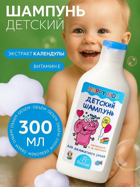Детский шампунь Floresan Ф-401n "Happy kids", гипоаллергенный, с пантенолом и календулой, 300мл.