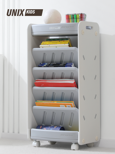 Детский стеллаж для книг UNIX Kids Storagebox — идеальное решение для организации пространства вашего ребенка и формирования у него любви к чтению! Стильный и функциональный, он станет не только практичным элементом интерьера, но и настоящим источником вдохновения для маленького книголюба! Мы заботимся о здоровье маленьких пользователей, поэтому тележка изготовлена из прочного пищевого пластика. Все детали тщательно обработаны, чтобы избежать острых углов, зазубрин и травм. Напольный стеллаж Монтессори имеет 5 полок, что позволяет удобно рассортировать и разместить книги, журналы и тетради. Пространство под нижней полкой можно использовать для красок, пластилина или другой канцелярии. Верхнюю полку также можно использовать для книг или хранения полезных мелочей. Высота органайзера 78,5 см, что позволяет малышу самостоятельно расставлять свое богатство и будет побуждать детей исследовать мир книг. Размещая любимые истории на видном месте, вы помогаете формировать у ребенка привычку к чтению с раннего возраста. Стеллаж помогает детям учиться организовывать свое пространство, находить и убирать свои вещи. Это способствует развитию ответственности и самостоятельности. С помощью этажерки на колесиках вы сможете создать уютный уголок для чтения, где ваш ребенок сможет наслаждаться книгами в комфортной обстановке. Добавьте мягкий плед и подушки — и вот вам идеальное место для погружения в мир фантазий! Чтение книг — это не только развлечение, но и возможность провести время вместе с родителями. Создайте традицию совместных чтений, выбирая литературу с полок новой этажерки!
