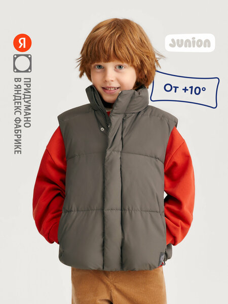 Junion Wear — это бренд одежды для детей, придуманный в Яндекс Фабрике настоящими родителями. Утеплённый жилет Junion Wear подходит для детей от 2 до 7 лет. Верх и подкладка сделаны из водонепроницаемой гладкой ткани, которая защищает от ветра, дождя и снега. В таком жилете будет комфортно в прохладную и сырую погоду. Модель прямого силуэта с воротником-стойкой, который закрывает шею. По низу — резинка со стоппером, чтобы плотнее затянуть жилет и защититься от ветра. У изделия есть декоративный пэтч и карманы, в которые можно положить важные мелочи. Удобный крой не стесняет движений. Жилет можно надеть поверх тёплой одежды и носить на прогулки или занятия на улице. Благодаря универсальному дизайну жилет сочетается с другой одеждой из коллекции Junion Wear — джоггерами, лонгсливами и свитшотами.