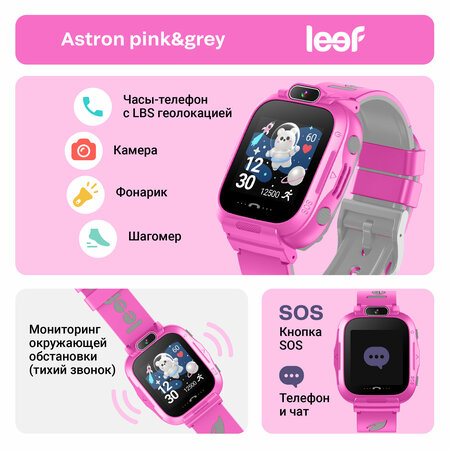 Умные часы LEEF Astron - это телефон-трекер в виде часов, который помогает родителям всегда оставаться с ребенком на связи, а также отследить его местоположение на карте. Активировав функцию «Тихий вызов» в приложении Leef Link можно прослушать окружающую обстановку вокруг ребенка или c помощью функции «Удаленное фото» получить на телефон снимок с часов. На самый крайний случай детские умные часы LEEF Astron оснащены кнопкой «SOS», при нажатии на которую происходит мгновенная отправка сигнала тревоги присматривающему за ребенком. С помощью мобильного приложения LEEF Link для ОС Android или iOS, установленного на смартфон, родители могут просматривать текущее местоположение ребенка на карте. Благодаря комбинированной технологии определения местоположения совмещающей позиционирование по спутниковой системе GPS и геолокацию по базовым станциям сетей сотовой связи детские часы LEEF Astron позволяют видеть ребенка на карте с точностью до 5-10 метров на улице. В приложении Leef Link Вы можете отследить дневные перемещения ребенка на карте. Благодаря функции голосового чата Вы можете обмениваться голосовыми сообщениями с Вашим ребенком. Возможно отправлять ребенку напоминания сделать что-то в заданное время. На время школьных занятий можно отключить часы, чтобы не мешали ребенку в классе. В часы встроен шагомер, позволяющий отслеживать дневную активность ребенка. Приложение Leef Link позволяет присматривать за детьми всей семьей. Можно приглашать в приложение бабушек и дедушек и они будут видеть местоположение внуков и получать те же уведомления, что и родители. В зависимости от настроек частоты обновления позиционирования, часы могут работать до 2 суток от одного заряда батареи.