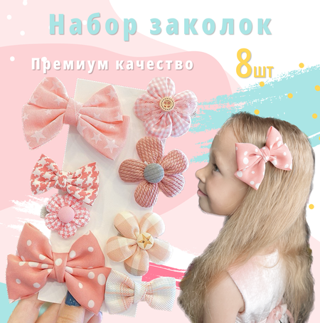 Отличный детский аксессуар для волос - заколки бантики. Стильный набор для девочек состоит из 8 заколок для волос бантиков и цветочков нежных цветов размером 8 на 8 см на картонной подложке. е сборы в школу и детский сад более интересными. Юная принцесса всегда будет в центре внимания. Аккуратные текстильные бантики выполнены из прочной ткани в классическом стиле. Такие заколочки подойдут к вашим любимым причёскам и сделают ежедневны Нарядные банты ручной работы хороший вариант универсальных аксессуаров для прически. Наш набор заколок для волос станет отличным подарком, а также идеально подойдет как бантик на выпускной и на праздник. В магазине VikiME вы найдёте лучшие подарки и аксессуары для принцесс!