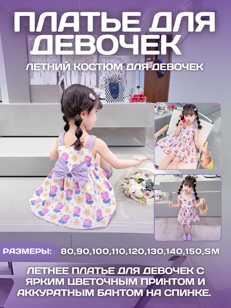 Летнее платье для девочек выполнено из мягкого двойного шифона с цветочным узором. Ткань лёгкая, пропускает воздух, не вызывает раздражений и подходит для тёплого времени года. Благодаря прямому крою платье не сковывает движения ребёнка и обеспечивает комфорт при носке. Модель надевается через голову, без застёжек, что упрощает переодевание. Изделие предназначено для девочек от 1 до 7 лет, доступно в размерах от 80 до 150 см. Материал обработан по технологии мягкого финиша, что делает поверхность приятной на ощупь и удобной для длительного ношения. Все швы выполнены с аккуратной отделкой, соответствуют стандарту плотности 12–14 стежков на 3 см. Безопасность изделия подтверждена категорией A — допускается прямой контакт с кожей младенца. Платье подходит для ежедневного использования, походов в сад, семейных мероприятий и прогулок. Цветочный узор придаёт изделию яркость, сохраняя нейтральность внешнего вида. Материал сохраняет форму после стирки, быстро сохнет и не требует специального ухода. Модель выпускается в двух цветах: фиолетовый и розовый с принтом по всей длине. Рекомендуется для весенне-летнего и раннеосеннего сезона. Не содержит дополнительных декоративных элементов, что обеспечивает лёгкость и практичность при ежедневной носке. Не имеет капюшона, низ платья — свободный, рукава отсутствуют.