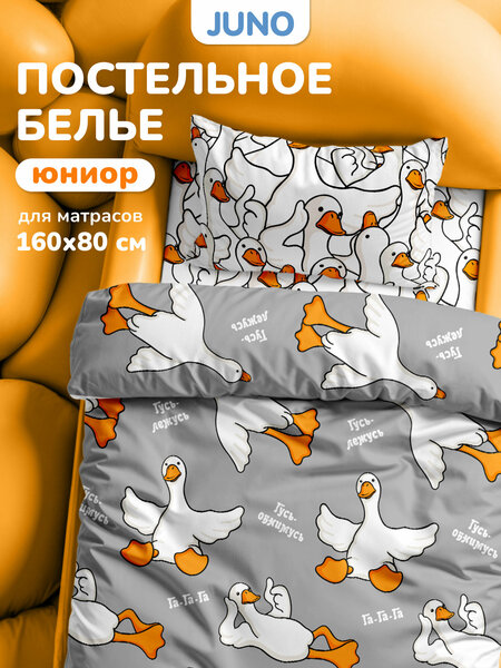 Для детей, которые уже спят в кроватке юниор, важно выбрать и качественное, и неповторимое постельное белье 1 спальное в милую постель. Бело-серый комплект с гусем-обнимусем порадует любителей этой популярной игрушки! Гусь-чиллюсь и гусь-лежусь очаровательно смотрятся на сером пододеяльнике, а также белых наволочке и простыни. Детское постельное белье с милыми гусями создано для ребенка, который хочет спать на комплекте с веселым дизайном. Такое постельное белье порадует любого ребенка. Хлопковый набор постельного белья идеально подойдет для кровати-юниора дома и на даче. В комплект входят: пододеяльник 147х112 см и наволочка 40х60 см, простынь 150х190 см. Такая простыня идеально подойдет на матрасы с размерами: 140х70 см (140*70, 70 на 140), 140х80 см (140 80, 80 на 140), 160х80 или 160х70. Детское постельное белье на одноместную кровать сделано из поплина. Мягкая ткань из 100% хлопка — источник комфорта на всю ночь. Нежнейший комплект из поплина — находка для мам, которые хотят подарить ребенку самые приятные условия для отдыха как летом, так и зимой. Наше постельное белье соответствует всем стандартам ГОСТ и требованиям безопасности, поэтому ваш ребенок будет наслаждаться приятными снами каждую ночь. Детское постельное односпальное белье производится в Иваново, России. Это отличный подарок для маленьких девочки или мальчика: например, дочери и сына, сестры и брата. Это лучший подарок ребенку: например, крестнице и крестнику или внучке и внуку. Такое постельное белье порадует и племянницу с племянником. КПБ также отлично сохраняет рисунок и не требует сложного ухода. Хб комплект стирается в машинке на деликатном режиме (40С). Бренд Juno предлагает детям красивый комплект постельного белья и качественный Ивановский текстиль для дома, с которым сны в детской комнате будут приятными и крепкими: он создаст эстетику в комнате. Обратите внимание, что постельное белье для ребенка является невозвратным товаром. Просьба проверять спальные комплекты на целостность, не покидая пункт выдачи. Приятных покупок! JUNO — мы знаем, о чем мечтают дети!