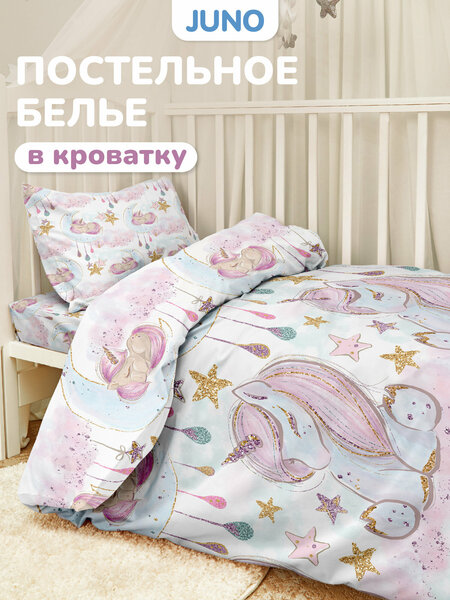 Ищете неповторимое постельное белье для детской? Juno знает, как порадовать вашего ребенка! Детское постельное белье (хб) для новорожденных выполнено в приятных оттенках. Малыш полюбит красивое постельное белье с принтом. Маленьким мечтательницам придется по душе комплект с прелестными единорогами! Спящий единорог с радужной гривой влюбляет в себя с первого взгляда. Блестящие золотые звезды на розово-голубом комплекте смотрятся особенно волшебно рядом со сказочными пони. А единорожки, резвящихся в нежно-розовых облаках, подарят радостные и добрые сны спящим принцессам. Комплект постельного белья для детей в круглую или овальную детскую кроватку, а также прямоугольную 120 на 60 (120х60) выполнен из нежнейшего поплина (100% хлопок). На таком мягком, уютном и эстетичном комплекте в кроватку ваш малыш будет засыпать гораздо быстрее. Всесезонное постельное белье для детской кровати подарит вашему ребенку максимальный комфорт в часы ночного сна, а еще оно отлично сохраняет рисунок. С мягким и нежным комплектом постельного белья для малыша новорожденным будет сладко спать в детской комнате дома и на даче. Это универсальный подарок для девочки: например, дочки или внучки на День Рождения и другие праздники. Он легко поддержит выбранную родителями эстетику для комнаты! Ясельное постельное белье — приятный сюрприз на выписку или в роддом: его можно подарить новорожденным брату или сестре. В хлопковый спальный набор для детской кроватки с матрасом 120х60, который можно купить для крестницы, входят: наволочка 40х60 см, простынь 150х110 см и пододеяльник 147х112 см. За постельным бельем из поплина легко ухаживать: кпб для младенцев стирается в машинке на 40С. Детское постельное белье российского производства (Иваново) с красивым рисунком, которое делается по всем стандартам безопасности — то, что нужно в дом! Качественный Ивановский текстиль для малышей порадует любого, кто хочет спать в милой постели. Постельное белье — лучший подарок ребенку. Мы знаем, о чем мечтают дети!