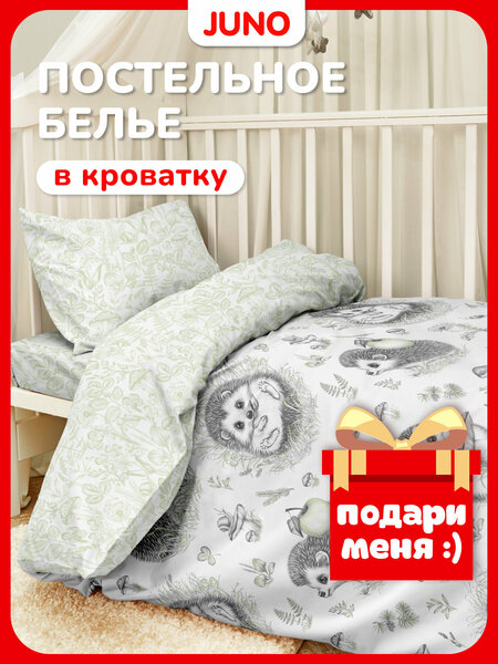 Ищете неповторимое постельное белье для детской? Juno знает, как порадовать вашего ребенка! Детское постельное белье (хб) для новорожденных выполнено в приятных оттенках. Малыш полюбит красивое постельное белье с принтом. Постельное белье (хб) для новорожденных с ежатами выполнено в белом и зеленом оттенках. Серые ежики и зеленые листочки прелестно смотрятся вместе. Ребенок полюбит красивый бело-салатовый комплект с очаровательными лесными зверушками. Комплект постельного белья для детей в круглую или овальную детскую кроватку, а также прямоугольную 120 на 60 (120х60) выполнен из нежнейшего поплина (100% хлопок). На таком мягком, уютном и эстетичном комплекте в кроватку ваш малыш будет засыпать гораздо быстрее. Всесезонное постельное белье для детской кровати подарит вашему ребенку максимальный комфорт в часы ночного сна, а еще оно отлично сохраняет рисунок. С мягким и нежным комплектом постельного белья для малыша новорожденным будет сладко спать в детской комнате дома и на даче. Это универсальный подарок для девочки или мальчика: например, дочки и сына, внука или внучки на День Рождения и другие праздники. Он легко поддержит выбранную родителями эстетику для комнаты! Ясельное постельное белье — приятный сюрприз на выписку или в роддом: его можно подарить новорожденным брату или сестре. В хлопковый спальный набор для детской кроватки с матрасом 120х60, который можно купить для крестника или крестницы, входят: наволочка 40х60 см, простынь 150х110 см и пододеяльник 147х112 см. За постельным бельем из поплина легко ухаживать: кпб для младенцев стирается в машинке на 40С. Детское постельное белье российского производства (Иваново) с красивым рисунком, которое делается по всем стандартам безопасности — то, что нужно в дом! Качественный Ивановский текстиль для малышей порадует любого, кто хочет спать в милой постели. Постельное белье — лучший подарок ребенку. Мы знаем, о чем мечтают дети!