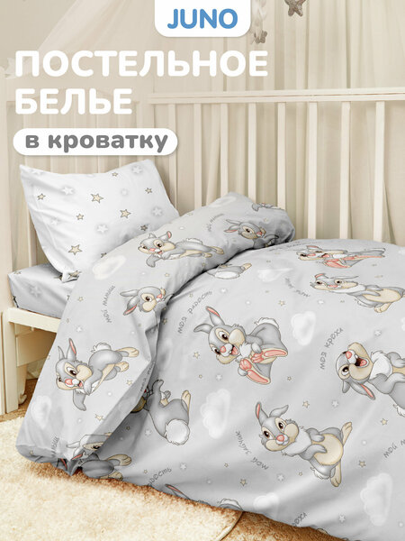 Ищете неповторимое постельное белье для детской? Juno знает, как порадовать вашего ребенка! Детское постельное белье (хб) для новорожденных выполнено в приятных оттенках. Малыш полюбит красивое постельное белье с принтом. Серое постельное белье с зайчонком Топотуном — другом олененка Бэмби — подарит ребенку самые добрые сны. Милые зайки очаровательно смотрятся на пододеяльнике. Наволочка и простынь, украшенные разноцветными звездочками, помогут малышу скорее расслабиться и уснуть. Комплект постельного белья для детей в круглую или овальную детскую кроватку, а также прямоугольную 120 на 60 (120х60) выполнен из нежнейшего поплина (100% хлопок). На таком мягком, уютном и эстетичном комплекте в кроватку ваш малыш будет засыпать гораздо быстрее. Всесезонное постельное белье для детской кровати подарит вашему ребенку максимальный комфорт в часы ночного сна, а еще оно отлично сохраняет рисунок. С мягким и нежным комплектом постельного белья для малыша новорожденным будет сладко спать в детской комнате дома и на даче. Это универсальный подарок для девочки: например, дочки или внучки на День Рождения и другие праздники. Он легко поддержит выбранную родителями эстетику для комнаты! Ясельное постельное белье — приятный сюрприз на выписку или в роддом: его можно подарить новорожденной сестре. В хлопковый спальный набор для детской кроватки с матрасом 120х60, который можно купить для крестницы, входят: наволочка 40х60 см, простынь 150х110 см и пододеяльник 147х112 см. За постельным бельем из поплина легко ухаживать: кпб для младенцев стирается в машинке на 40С. Детское постельное белье российского производства (Иваново) с красивым рисунком, которое делается по всем стандартам безопасности — то, что нужно в дом! Качественный Ивановский текстиль для малышей порадует любого, кто хочет спать в милой постели. Постельное белье — лучший подарок ребенку. Мы знаем, о чем мечтают дети!