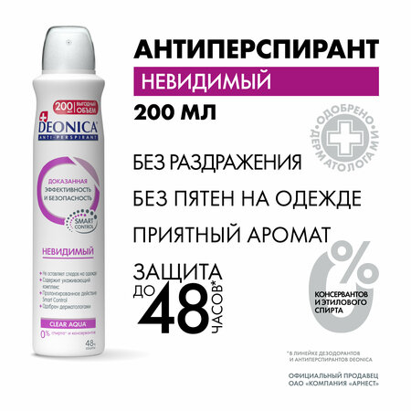 Уникальный антиперспирант Deonica "Невидимый" благодаря специальной формуле не оставляет следов и пятен на черной, белой и цветной одежде и обеспечивает надежную защиту от пота и запаха на 48 часов. Эффективная защита от пота и запаха в течение 48 часов. Не оставляет следов на белой, черной и цветной одежде. Одобрен дерматологами. Клинически протестирован.0% спирта и парабенов. Имеет нежный цветочный аромат. Содержит термически активированный хлоргидрат алюминия, который не забивает поры и эффективно справляется с потом и запахом без вреда для здоровья. Придает коже невероятную мягкость благодаря ингредиенту Бисаболол (получают из аптечной ромашки), который смягчает кожу и помогает справиться с раздражениями. Deonica – антиперспирант, который гарантированно подарит Вам защиту и ощущение свежести в течение дня! Рецептуры всех антиперспирантов Deonica разработаны в Швейцарии и сочетают в себе натуральные и безопасные активные компоненты, а также высокоэффективную защиту. Одобренная дерматологами формула подходит для людей с чувствительной кожей. Натуральные активные компоненты в составе антиперспиранта гарантировано защитят от неприятного запаха, а особая формула не оставит белых следов на одежде. Высокая эффективность Deonica подтверждена клиническими испытаниями и потребительскими тестами в европейских лабораториях. Сбалансированная линейка средств рассчитана на физиологические особенности активности женщин и мужчин, на активность в течение дня и особенности кожи. С инновационным антиперспирантом нового поколения Deonica Вы сможете чувствовать себя уверенно при любых обстоятельствах.