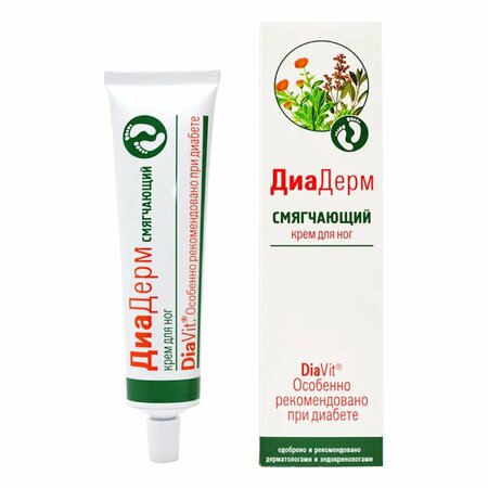Крем ДиаДерм Смягчающий особенно рекомендован для людей с диабетом. Эффективно питает, увлажняет и смягчает кожу ног, уменьшает сухость, шелушение и интенсивность зуда, Крем ДиаДерм Смягчающий вернет ощущение комфорта и увлажненности коже ног, потому что в составе - богатый комплекс натуральных ингредиентов: • Влагоудерживающий комплекс (мочевина, аллантоин и глицерин) интенсивно смягчает роговой слой кожи, способствует уменьшению гиперкератоза (чрезмерное утолщение рогового слоя кожи) и препятствует его образованию; • Липидосодержащий комплекс (масло авокадо, мосло подсолнечное и мосло кокосовое) доставляет коже недостающие липиды, препятствует чрезмерной потере влаги; • Антибактериальный комплекс (масло шалфея, камфора и фарнезол) защищает кожу от присоединения бактериальной инфекции; • Метаболический комплекс (витамины А, Е и F) улучшает обменные процессы и процессы эпителизации; • Регенерирующий комплекс (экстракты мяты, шалфея и календулы) способствует быстрому заживлению тканей. Рекомендован врачами - эндокринологами и дерматологами для ежедневного ухода за сухой кожей ног при диабете. Не является лекарством. Проведена Добровольная клиническая апробация на базе Центра Диабета, г. Самара и на Кафедре дерматовенерологии и клинической микологии с курсом лабораторной диагностики и лабораторной микологии рмапо, г. Москва. Серия Диадерм – это 5 специальных кремов для ухода за кожей при диабете с доказанной эффективностью, которые улучшают качество жизни: 1. Крем ДиаДерм Регенерирующий 2. Крем ДиаДерм Смягчающий 3. Крем-тальк Диадерм 4. Крем ДиаДерм для рук и ногтей 5. Крем для ног ДиаДерм Интенсив