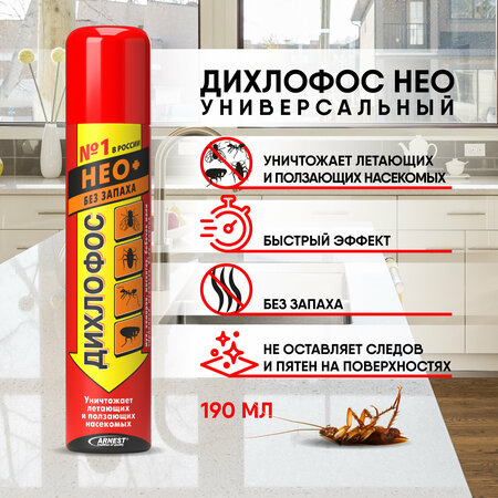 Универсальное средство от насекомых в аэрозольной упаковке, доказавшее свою эффективность на опыте четырёх поколений пользователей. Незаменимое в домашнем хозяйстве универсальное средство для борьбы со всеми видами бытовых насекомых. В составе современного Дихлофоса — сочетание трёх современных действующих веществ, усиленное специальным веществом-синергистом. Не оставляет насекомым шанса выжить. Уничтожает все виды бытовых насекомых: мух, комаров, тараканов, муравьёв, бабочек моли, клопов, блох и других. Создаёт защитный барьер на обработанных поверхностях, действует до 2 недель. Современная формула из трёх действующих веществ. Удобный спрей-колпак с трубкой обеспечивает фокусное распыление, удобное для обработки щелей. Не имеет запаха.