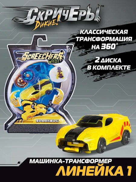 Машинка-трансформер "Дикий скричер" - единственная в своем роде игрушка. Она превращается в зверя, переворачиваясь в воздухе на 360°! Машинка разгоняется, ловит специальный диск, делает кувырок и самостоятельно трансформируется прямо в воздухе. Обратно в машинку игрушка собирается вручную. Несколько движений - и она опять готова к новому кувырку. Машинка-трансформер "Скричер СпаркБаг" обладает прочной конструкцией с надежными креплениями и выполнена из высококачественного материала. В набор входит машинка-трансформер (8х4х3 см) и 2 магнитных диска диаметром 3 см. Игрушка упакована в блистер (16х5х21 см). Всего в линейке "Скричеров" представлено 16 машинок, каждая из которых является отдельным персонажем. Машинки могут превращаться в животных, птиц, динозавров или рептилий. Самое время собрать всю команду "Скричеров"!