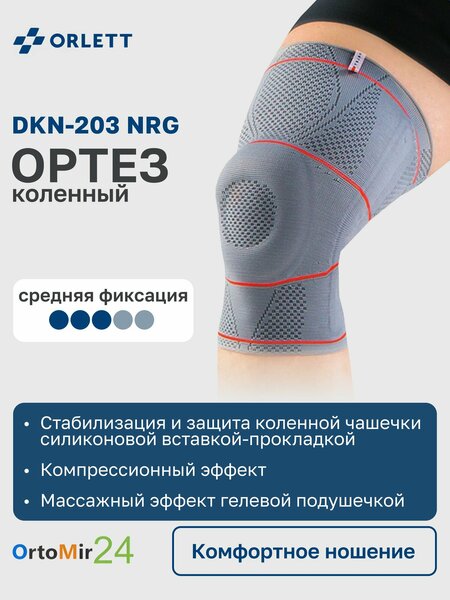 Ортез DKN-203 NRG Orlett Energy Line на коленный сустав GenuFlex стабилизирует и разгружает коленный сустав, ограничивает патологические боковые движения. Описание Ортез орлетт на коленный сустав GenuFlex стабилизирует и разгружает коленный сустав, ограничивает патологические боковые движения. Кольцевидная гелевая подушечка фиксирует коленную чашечку и обеспечивает интенсивную стимуляцию проприоцепторов (рецепторов «суставного» чувства). Назначения