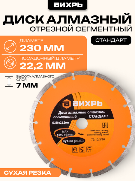 Диск алмазный отрезной сегментный стандарт, 230 х 22,2 мм, сухая резка Вихрь – это высококачественный алмазный отрезной диск, предназначенный для использования с угловыми шлифмашинами (болгарками). Он обеспечивает эффективную и сухую резку гранитных, бетонных, кирпичных и каменных изделий. Диск алмазный отрезной сегментный стандарт обладает рядом особенностей, которые делают его отличным выбором для профессионалов и любителей. Он предназначен для резки «сухим методом» изделий из твердых материалов, таких как армированный бетон, камень, мрамор, шлакоблоки, гранит и пр. Благодаря наличию «прорезей» сегментов в диске, процесс обработки осуществляется с эффективным выбросом продуктов резани. Технические характеристики диска алмазного отрезного сегментного стандарт включают: - Диаметр диска: 230 мм; - Толщина: 2,0 мм; - Максимальное количество оборотов: 6600 об/мин; - Посадочный диаметр: 22,2 мм. В упаковке поставляется один алмазный отрезной диск. Выбирая диск алмазный отрезной сегментный стандарт, вы получаете надежный и качественный инструмент для эффективной и сухой резки различных материалов.