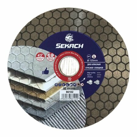 Круг алмазный Sekach 125мм сплошной диск для сухой резки керамогранита и керамической плитки под 45 градусов на УШМ серия 7D Резание керамической плитки под 45 градусов «заусовка» – наиболее распространенная операция в отделочных работах. Многие мастера выполняют ее вручную углошлифовальной машиной. Требования к алмазному диску: достаточная жесткость корпуса, в то же время мягкость резания, возможность подшлифовки кромки. Именно такими свойствами и обладает диск Sekach125мм. Широкий двухсторонний алмазоносный слой 25 мм армирует корпус, делает его жестким. В то же время алмазоносная связка с «сотовым» рисунком слоя делает резание мягким и высокопроизводительным. Большая плоскость создает эффект «опоры», направляя диск строго по прямой. Дополнительно можно подшлифовать кромку торца плитки. С таким диском заусовка 45° становится сплошным удовольствием! Диск выпускается диаметром 125 мм, посадочным местом 22,2 мм. Применяется на УШМ без применения охлаждения.
