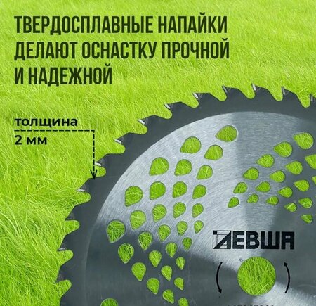 Диск нож для триммера 255*25,4*1,2 мм от бренда "Левша" - это сменная насадка для садовых триммеров и косилок. Он предназначен для спиливания веток, кустарника и небольших деревьев в бытовом использовании. Особенностью данного диска является наличие твердосплавных напаек на всех сорока зубьях. Это делает оснастку прочной и надежной, увеличивая срок ее службы. Дополнительные отверстия на диске снижают нагрузку на редуктор при работе триммера, что обеспечивает его долговечность и эффективность. Геометрия ножей диска способствует увеличению ресурса и скорости резания травы, что делает процесс ухода за садом более быстрым и комфортным. В целом, диск нож для триммера от "Левша" является отличным выбором для тех, кто ищет надежную и эффективную насадку для своего садового инструмента.