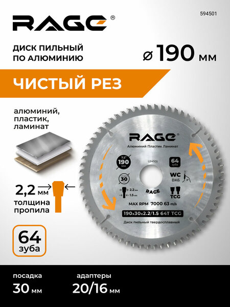 Диск пильный по алюминию 190 мм 64Z посадка 30 мм + кольцо 20 мм 16 мм RAGE by VIRA