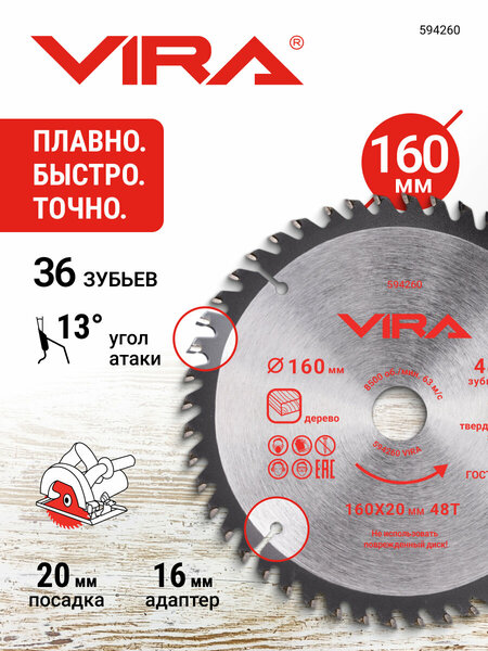 Диск пильный по дереву 160 мм посадка 20 мм адаптер 16 мм 48 зубьев VIRA