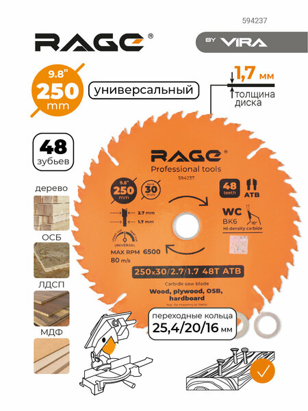 Диск пильный по дереву 250 мм универсальный 48 зубьев посадка 30 мм с переходными кольцами 25.4, 20 и 16 мм Rage by Vira
