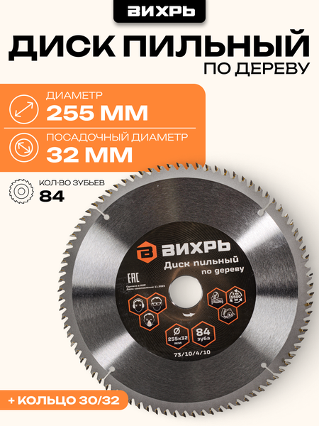 Диск пильный по дереву 255х32 мм, 84 зуба+кольцо 30/32 Вихрь - это высококачественный инструмент, предназначенный для эффективной и быстрой обработки дерева. Диск имеет диаметр 255 мм и посадочный диаметр 32 мм. Это обеспечивает широкий диапазон применения, позволяя использовать его для различных задач, таких как резка, распил и обработка деревянных деталей. Количество зубьев диска составляет 84 штуки. Это обеспечивает высокую производительность и точность при работе с деревом. Максимальное количество оборотов диска достигает 5500 об/мин, что гарантирует быстрое и качественное выполнение работ. Особенностью данного диска является его твердосплавное покрытие. Это обеспечивает долгий срок службы и высокую износостойкость, позволяя использовать диск для продолжительной работы без потери качества. В комплекте с диском идет переходное кольцо 30/32, что позволяет использовать его с различными станками и пилами. Таким образом, диск пильный по дереву 255х32 мм, 84 зуба+кольцо 30/32 Вихрь является отличным выбором для тех, кто ищет надежный и качественный инструмент для работы с деревом.