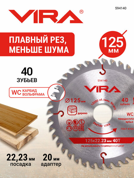 Диск пильный по дереву с пазами 125 мм посадка 22.23 мм адаптер 20 мм 40 зубьев VIRA