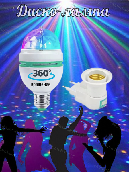 Диско лампа вращающаяся светодиодная в розетку с переходником Е27/Диско-шар в розетку Создайте атмосферу праздника с помощью диско лампы. Лампа вращается, создавая динамический поток разноцветных лучей, которые наполняют комнату яркими и красивыми огнями. Лампа подключается как в розетку, так и ввинчивается в люстру или светильник, что позволяет установить ее на любую удобную поверхность. Используемые светодиоды имеют ресурс 100 тыс часов, что обеспечивает долгий срок службы лампы. Диско лампа имеет 8 режимов свечения, включая мигающий, плавная смена цвета и постоянный режим. Лампа выполнена из качественного пластика и акрила, имеет класс пылевлагозащиты IP 20 В комплект входит лампа, цокольный переходник с вилкой и фигурные насадки на лампы. Отличное световое решение для организации различных праздников, таких как Новый год, DISCO-вечеринка или детский праздник.