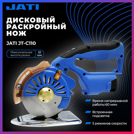 Дисковый раскройный нож JT- C110 с аккумулятором с не требующим обслуживания (бесщеточным) серводвигателем постоянного тока обеспечивает комфорт и высокое качество резки. Эргономичный, прочный, предназначен для раскроя легких и средних тканей.5-ступенчатые настройки скорости: 800, 950, 1100, 1250, 1400 об/мин позволят вам работать с различными типами задач. Встроенная светодиодная лампа - 3-ступенчатое освещение рабочего поля. Максимальная толщина реза: 32 мм. Диаметр лезвия: 110 мм В комплекте зарядное устройство и 2 аккумулятора. Портативен и не имеет провода. Время непрерывной работы 60 мин. Время зарядки 120 мин. Оснащен автоматическим заточным устройством. Многогранный диск облегчает раскрой.