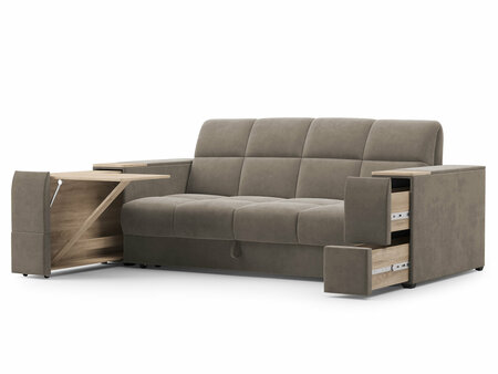 Диван-аккордеон "Флай" с журнальным столиком и ящиком для белья - это современное и функциональное решение для вашего дома. Диван-аккордеон "Флай" легко трансформируется в просторную и удобную кровать, что позволяет использовать его в спальне. Механизм "Аккордеон" надежен и прост в использовании, а подлокотники служат дополнительными тумбами с ящиками на телескопических направляющих, в которых можно хранить вещи. В другом подлокотнике встроено удобное рабочее место для ноутбука или чтения книг. Каркас дивана выполнен из металла, что обеспечивает прочность и долговечность. Матрас из пенополиуретана обеспечивает комфортный отдых и исключает боли в спине благодаря ортопедическим ламелям. Съемный чехол из велюра с декоративной строчкой придает дивану элегантный вид и легко чистится. Диван доступен в коричневом и бежевом цвете, что позволяет выбрать подходящий вариант для любого интерьера. "Флай" - это удобный диван, который идеально подойдет для отдыха и сна. Он выполнен в современном стиле и станет стильным дополнением к любому интерьеру.