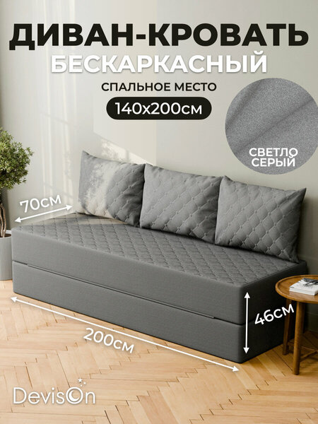 Функциональная мягкая мебель, которая легко трансформируется в два полноценных спальных места. Бескаркасный диван имеет множество преимуществ: - не имеет острых углов, поэтому безопасен для маленьких детей - отлично поместится в детской комнате, спальне, гостиной и даже на балконе - конструкция из пенополиуретана высокой упругости OrtoFoam, использующегося в матрасах, обеспечит отсутствие провалов и качественный сон - легкая и удобная доставка – диван приедет к вам скрученным в рулон небольшого размера, и лишь после распаковки диван примет заявленный размер. Рекомендуем взбить подушки, чтобы они лучше приняли свою форму.