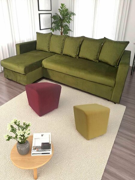 Удобный угловой диван - кровать "Престиж" с универсальным углом и пуфом для ног в комплекте — идеальное решение для кухонь, гостиных или залов. Мягкий и стильный большой угловой диван, с универсальным углом станет не только комфортным местом для отдыха, но и практичным просторным спальным местом для постоянного использования или для гостей. С общей шириной 220 см и спальным местом размером 140 х 195 см, диван угловой в гостиную "Престиж" подходит как для взрослых, так и для подростков. Высота посадочного места составляет 44 см, а глубина без подушек — 70 см, что обеспечивает максимальный комфорт. Высота подлокотников — 70 см, ширина подлокотников 12 см, высота спинки от пола — 70 см, обеспечивая удобство для любого роста. Подушки имеют несъемные чехлы с наполнением из крошки ППУ. Мелкая фракция крошки ППУ позволяет добиться высокого уровня мягкости. Молния на чехле подушки для регулировки наполнения, которая позволяет пользователю изменять уровень комфорта и жесткости подушки. Угловой диван раскладной оснащен оттоманкой размером 140 х 64 см, которая может служить как дополнительным местом для сидения, так и уютным уголком для отдыха. Два больших ящика для хранения под сиденьем позволяет удобно разместить постельное белье или другие вещи, и делает его прекрасным вариантом для компактных комнат. Каркас дивана выполнен из прочных материалов, что гарантирует долговечность и надежность. Ножки придают современный вид в стиле модерн, минимализм или лофт, а цветовое решение делает его стильным акцентом в любом интерьере. Ткань велюр Kabrio устойчива легко чистится, что делает диван идеальным для семей с детьми. Стойкость к истиранию составляет 20 000 циклов. Большой угловой диван раскладной является новинкой 2025 года. Угловой диван в гостиную оснащен высокоэластичным поролоном с высокой степенью износостойкости плотностью 22-36кг/м3, который используется в диванах от бюджетных до люксовых моделей. Мягкий поролон толщиной 10 см гарантирует приятные ощущения. Толщина поролона 10 см — идеальный баланс между комфортом и поддержкой, что гарантирует сохранять свою форму даже при регулярном использовании без дополнительных матрасов и топперов. Диваны Аметист изготовлены из фанеры с низким содержанием формальдегидов, что обеспечивает безопасность, а высокое качество снижает риск деформации. Специальные антисептические составы предотвращают появление паразитов и грибка. Надежная фурнитура обеспечивает долговечность конструкции, а длительная гарантия подтверждает качество. Задняя стенка дивана обита основной тканью, что обеспечивает гармоничный внешний вид и позволяет размещать его в центре комнаты. Универсальный угол (правый угол, левый угол). Инструкция по сборке прилагается. Мягкий пуф для дивана, прикроватный и для ног «Алекс» Маленький квадратный пуфик «Алекс» (высота 38 см, ширина 38 см, глубина 38 см) — идеальный выбор для вашего дома! Этот мягкий пуф для гостиной отлично подойдет как придиванный пуф, пуфик для ног, прикроватный пуф для спальни или уютное место у кресла и дивана. Прочный каркас из фанеры, наполнитель премиум-поролон (40 мм сверху, 20 мм по бокам) обеспечивают удобство и долговечность. Антивандальный велюр TESLA или ткань Kabrio — лучшие материалы для владельцев домашних питомцев, устойчивы к коготкам, легки в уходе, надолго сохраняют 
