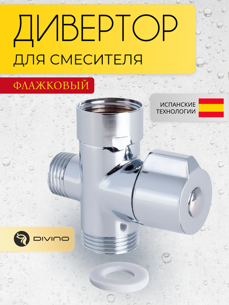 Дивертор для смесителя (флажковый) DIVINO Цвет Серебристый Арт. CS-30 Код 10356. Материал корпуса - латунь. Запорный клапан - пластиковый картридж с керамическими пластинами, который обеспечит бесшумную и плавную работу, а так же гарантирует долгий срок эксплуатации. Применяется для перенаправления потока воды с излива в душевой кран и обратно. Переключатель душа поворотный. Угол поворота 90 градусов. Входная резьба 3/4, выходная резьба 3/4, выход на лейку 1/2. Вес дивертора 180гр. Гарантийный срок на комплектующие 1 год.