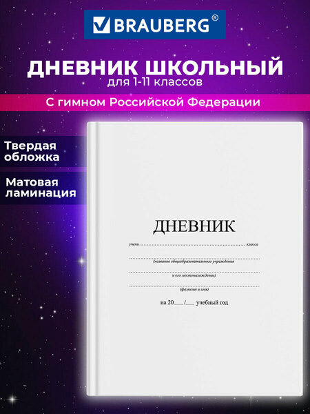 Школьный дневник BRAUBERG идеально подходит для учеников 1-11 классов. Этот дневник школьный станет незаменимым помощником как для девочек, так и для мальчиков, помогая фиксировать оценки и домашние задания, замечания и достижения. Твердая белая обложка с матовой ламинацией не только защищает страницы, но и придает стильный вид. Внутренний блок имеет 40 листов плотной офсетной бумаги, что обеспечивает долговечность использования. Дневник школьный 5-11 класса гармонично сочетает функциональность и эстетичность, что делает его привлекательным для девочек, и для мальчиков. Школьный дневник также станет отличным выбором для тех, кто ищет дневник в школу белый, соответствующий всем требованиям. Помогите вашему ребенку организовать учебный процесс с этим надежным и стильным дневником для девочки и мальчика. • Тип изделия: дневник матовый. • Тип обложки: твердый книжный переплет. • Тип спецэффектов на обложке: глянцевая ламинация. • Основной цвет обложки: белый. • Серия: Print. • Дизайн: Белый. • Пол ребенка: универсальный. • Внутренний блок: офсет. • Плотность внутреннего блока: 60 г/м2. • Цвет внутреннего блока: белый. • Тип застежки: нет. • Индивидуальная упаковка: да. • Артикул производителя: 106641.