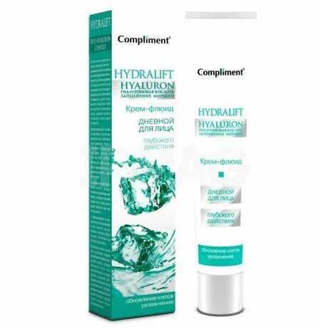 Compliment hydralift hyaluron крем-флюид для лица глубокого действия дневной 50мл Compliment Hydralift Hyaluron Крем-флюид Для Лица Глубокого Действия Дневной 50мл. Состав: гиалуроновая кислота. Показания: для лица. Действие: Обновление клеток, увлажнение. COMPLIMENT HYDRALIFT HYALURON крем-флюид для лица глубокого действия дневной 50МЛКосметические средства на основе гиалуроновой кислоты - современный способ омоложения кожи. Благодаря своей исключительной способности удерживать в большом количестве водугиалуроновая кислота выполняет важнейшую роль в обеспечении оптимального уровня увлажненности тканей кожи. Также она участвует в регенерации тканей, позволяя сохранять поверхность кожи гладкой и подтянутой. Гиалуроновая кислота - это один из важнейших строительных материалов кожи, обеспечивающий увлажнение, упругость и эластичность. Формула дневного крема основана на DUO-HYALURON COMPLEX, сочетающего в себе силу двух видов гиалуроновой кислоты - высокомолекулярной и низкомолекулярной: - высокомолекулярная гиалуроновая кислота обладает интенсивным увлажняющим действием, она образует устойчивую гелевую сетку, которая разглаживает поверхность кожи сразу после нанесения; - низкомолекулярная гиалуроновая кислота глубоко проникает в кожу, помогает улучшить упругость и уменьшить глубокие морщины, обеспечивая коже молодой и сияющий вид. Комплексная система воздействия способствует поддержке долговременной выработки гиалуроновой кислоты, придавая подтянутый контур лица, устраняя морщины, активируя процессы омоложения, обеспечивая восстановление тургора и эластичности кожи. Происходит усиление и пролонгация действия косметологических процедур (пилинг, очищение, питание и регенерация кожи). Подтягивающий крем на основе чистой гиалуроновой кислоты разработан специально для интенсивного питания и омоложения кожи лица. Средство обеспечивает мгновенное увлажнение и лифтинг поверхностных слоев эпидермиса, восстановление водно-электролитного баланса кожи на клеточном уровне и заметную редукцию глубоких морщин. Крем образует на поверхности кожи невидимую воздухопроницаемую пленку - слой с гиалуроновой кислотой, который стимулирует активность фибропластов, препятствует потере жизненно важной влаги и защищает от негативных факторов окружающей среды. Этот компонент помогает снизить скорость испарения воды, позволяя ей активно питать кожу, делая ее ровной и гладкой. Оливковое масло в составе крема интенсивно смягчает глубокие слои эпидермиса, а термальная вода устраняет покраснения, раздражение, ощущение дискомфорта, усиливает естественные защитные свойства кожи. Легкая текстура крема легко наносится, не оставляет жирного блеска и является прекрасной основой под дневной макияж. Комплекс UV фильтров защищает кожу от вредных ультрафиолетовых лучей. Уже после первого применения лицо выглядит свежим и отдохнувшим, восстановленные клетки кожи вновь обретают эластичность и упругость. Регулярное ежедневное использование средства способствует пролонгированному эффекту. наносить мягкими массирующими движениями каждое утро на очищенную кожу лица и шеи, избегая области вокруг глаз.