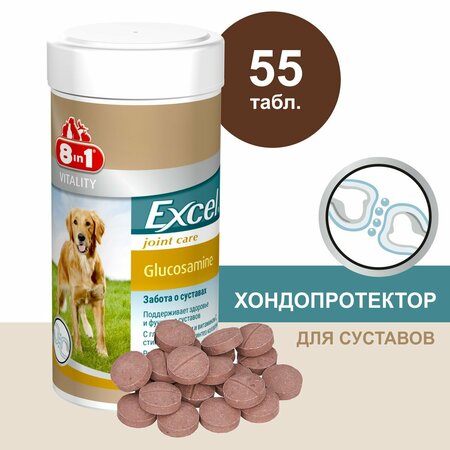 «8 в 1 Эксель Глюкозамин» (8 in 1 Excel Glucosamine) - кормовая добавка для нормализации и поддержания функций опорно-двигательного аппарата у собак. Хондропротектор в таблетках для поддержания здоровья и функции суставов. Глюкозамин входит в состав соединительной, хрящевой тканей и синовиальной жидкости. Ежедневное употребление глюкозамина улучшает регенерацию тканей сустава и препятствует его разрушению. Добавка содержит стабилизированный витамин C, который способствует выработке коллагена, поддерживая эластичность соединительной ткани и связок. Помогает предупредить развитие болезней суставов и ускорить выздоровление в случае их возникновения. Может использоваться для профилактики и в комплексной терапии болезней суставов. Рекомендации по применению Добавку дают собакам самостоятельно, в смеси с кормом или принудительно на корень языка. вес (кг) таблетки (шт) до 10 1 11-20 2 21-30 3 30+ 4 Курс приема: не менее 3 месяцев Состав: минеральные вещества, моллюски и раки (глюкозамин гидрохлорид 11,3 %), стеариновая кислота, магния стеарат. Не содержит искусственных консервантов и красителей. Аналитические компоненты: белок 22.0 %, масла и жиры 4.0 %, клетчатка 2.0 %, зола 35.0 %. Добавки: Витамин С 5000 мг/кг.