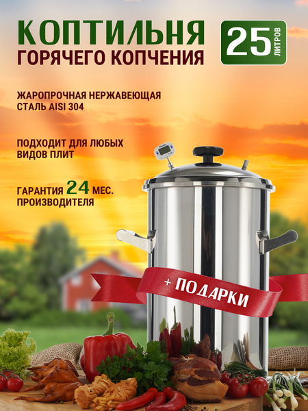 Выгодное предложение для тех, кто ценит своё время и деньги — функциональная и надёжная домашняя коптильня для горячего копчения от производителя “Вкус Качества” из пищевой нержавеющей стали объёмом 25 литров. В ней вы можете смело коптить любые продукты: птицу, мясо, сало, рыбу, рёбра, бекон, сыры, фрукты и овощи! Продукты, приготовленные в коптильне, обладают отменными вкусовыми качествами и просты в приготовлении. Коптилка изготовлена из жаропрочной нержавеющей стали 12Х17 по ГОСТ 5632-72, которая является коррозионно-стойкой хромистой сталью ферритного класса. Жаропрочность данной марки материала до 850 °C. Не ржавеет и не деформируется от высоких температур, безопасна для здоровья. Не прогорит — толщина дна 4 мм. Дыма в доме не будет - полная герметичность. Можно коптить прямо на кухне. Трёхъярусная. Благодаря тому, что коптильня имеет три независимых решётки, она вмещает гораздо больше продуктов. Компактная. Удобная в эксплуатации и легкая в транспортировке. Не требует специального места хранения. Собственное российское производство полного цикла. Каждое изделие проходит контроль ОТК! Благодаря качественной стали и полированной поверхности легко отмывается. Прослужит вам долгие годы в отличие от одноразовых дешёвых коптилен. Отличный подарок к любому празднику!