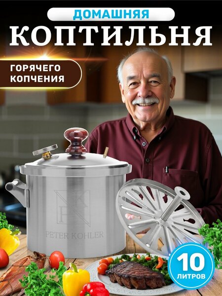 Коптильня горячего копчения Peter Kohler, 10 л - это надежный и удобный инструмент для приготовления ароматных деликатесов прямо у себя на кухне. Коптильня изготовлена из пищевой нержавеющей стали, что обеспечивает долговечность и безопасность использования. Каркас коптильни монолитный и не деформируется при нагревании, а дно толстое и штампованное. Крышка надежно вкручивается в центральную стойку коптильни и не нагревается, что делает процесс копчения безопасным. Для копчения используется щепа, что позволяет приготовить ароматные деликатесы без использования консервантов и других химических добавок. Дым не попадает в квартиру благодаря гидрозатвору и специальному дымоотводу, который выводит дым в вентиляцию или форточку. Каждая коптильня проходит проверку качества, все металлические кромки полируются и безопасны от порезов. Корпус коптильни имеет фирменную гравировку и легко моется после копчения. В комплекте с коптильней идет книга с базовыми рецептами, на основе которых можно изобрести много необычных и вкусных блюд. В комплекте также есть все необходимое для первого копчения. Коптильня имеет серебристый цвет и компактные размеры (высота 30 см, диаметр корпуса 26 см), что делает ее удобной для использования на любой кухне. Выбирая коптильню горячего копчения Peter Kohler, вы получаете качественный и надежный инструмент для приготовления ароматных и полезных деликатесов прямо у себя дома.