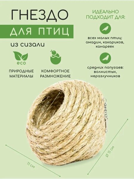 Домик для попугаев и птиц - это уютное и функциональное решение для обеспечения комфорта и безопасности ваших пернатых друзей. Этот аксессуар идеально подходит для установки в клетку или вольере, предоставляя попугаям и птицам тихое и защищенное пространство для отдыха и размножения. Подходит домик для амадинов. Гнездо для попугаев и птиц в клетку разработано с учетом естественных потребностей пернатых, предоставляя им ощущение безопасности и уюта, необходимое для их здоровья и благополучия. Это отличный способ создать комфортную среду для ваших птиц. Домик гнездо для попугаев - это не только практичное, но и стильное дополнение к вашему домашнему интерьеру, которое будет радовать вас и ваших пернатых друзей долгие годы. Домик гнездо для попугаев и птиц, грызунов в клетку. Сизалевое гнездо в форме шара, так напоминающее настоящее птичье гнездо! Сизáль — натуральное грубое волокно, получаемое из листьев растения Agava из рода агавы, иногда «сизалем» называют и само растение. Данные волокна выделяют из свежих листьев, декортикационные машины мнут и раздавливают листья, в результате отделяется волокно, которое затем промывают, сушат на солнце и обрабатывают щётками. Сизали- это природное волокно и благодаря натуральному плетению оно выгодно отличается от гнезд из пластика. Склеивающий волокно состав, состоит из полимера и смолы и не привлекателен для поедания птицами и грызунами. Гнездо оснащено металлическими креплениями, поэтому может быть установлен на горизонтальных стенках клетки! Домик для разведения, домик для размножения. Важно, волокно сизали имеет специфический природный запах, который очень нравится птичкам. Сам клеевой состав абсолютно ничем не пахнет. Эксплуатация в сухом помещении при комнатной температуре. Не мыть под водой, сизаль пористое волокно очень хорошо впитает жидкость и как следствие может расклеится гнездо, как вариант для ухода, использовать влажную тряпочку.