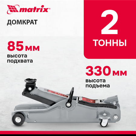 Подкатной гидравлический домкрат Matrix Low Profile 51018 с высотой подхвата 85 мм — полупрофессиональное гаражное оборудование, способное поднимать груз массой до 2 т на высоту до 330 мм. Очень маленькая высота подхвата 85 мм позволяет использовать домкрат для автомашин с небольшим клиренсом. Домкрат будет полезен как в автомастерской, так и в частном гараже.