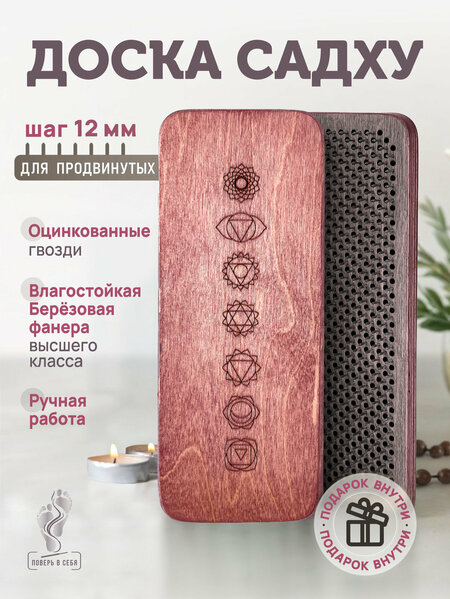 Садху доски Расстояние между гвоздями 12мм Древнейший, мощный инструмент пробуждения собственной, внутренней энергии. Достаточно практиковать от 1 минуты ежедневно, что бы усилить свой иммунитет. На ступнях ног более 40000 нервных окончания, "стояние на гвоздях" позволяет за короткое время дать мощный импульс для всего организма. Так же это инструмент проработки целей и намерения достижений. Наши Садху отличаются качеством, при производстве мы используем материалы высшего качества. Каждый экземпляр производится в ручную, для соответствия качества, у нас есть служба контроля. Для наших покупателей, мы отправляем подарки: Мешочек для аккуратного хранения; Благовония; Инструкцию. Доски Садху 2 шт с ответными отверстиями; Чехол; Инструкция, календарь; Благовония; До 48 размера ноги; Покрыты яхтенным маслом, что позволяет сохранить запах дерева; Оцинкованные гвозди, нержавеющие; Размер 32*13*3.5; Вес 1.3 кг