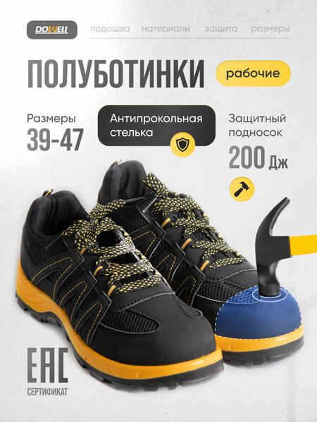 Полуботинки рабочие S1 P SRC с маркировкой "Dowell" Спецобувь мужская защищает ноги от механических воздействий, таких как удары в носочную часть энергией 200 Дж. Материал верха рабочих ботинок выполнен из искусственной кожи с элементами из текстильного материала. Внутри – сетка (65% полиэстер, 25% хлопок, 10% эластан). Стальной подносок обеспечивает максимальную защиту ноги от ударов в носочную часть. Рабочая обувь имеет двухслойную полиуретановую подошву литьевого метода крепления, которая обеспечит отсутствие скольжений, водонепроницаемость и антистатичность, мягкая стелька EVA обеспечит комфорт при носке. СИЗ - рабочие ботинки снабжены наличием стальной стельки, защищающей от проколов.